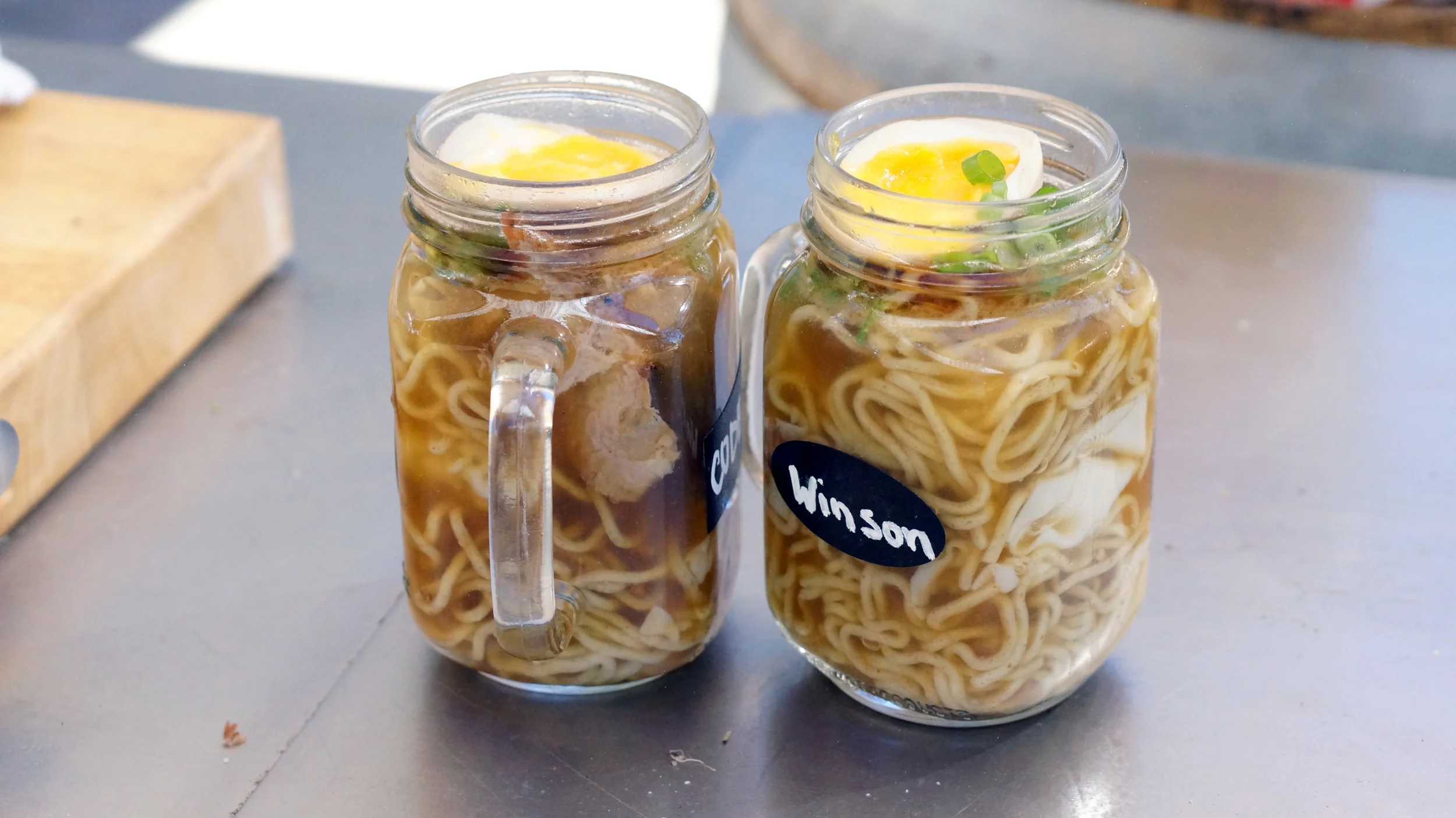 We have a noodle bar at work, so I brought our marinated eggs, 'ajitsuke tamago,' and some of our concentrated dashi to finish off the broth. I even threw in some scrapes and skin from our 18-month house-cured prosciutto, to substitute bonito flakes, and it worked. Not smokey, but very developed, nutty, and extra porky. It was the three of us in an assembly-line serving a line of hungry people that quickly developed; it felt like I was working in a soup kitchen.
