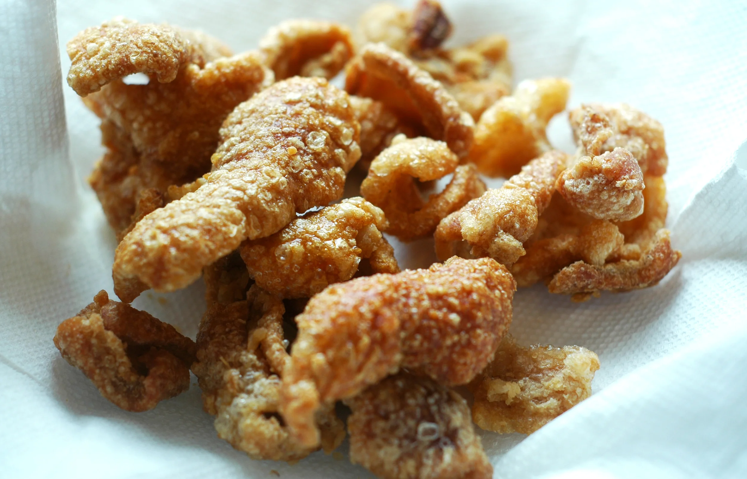 Chicharones at home is easy. Remove the skin from the belly, leaving about 1/4 inch of fat. Put your pork skins into a non-stick pan and season with salt and a touch of vinegar to taste. Do not crowd the pan or else the skins will stick to each other later on in the cooking process. Add water just to cover, then add twice that amount of water (this is just a method of measurement to make you have enough water). Boil the skin until all water has evaporated and then turn the heat to low. At this point, the excess fat from the skin should have rendered out enough to cover the skins. If this is not the case, add a neutral oil so that the skins are submerged. Keep the heat on low and continue to render until the skin becomes crispy. Toss with additional salt if needed and your choice of seasoning (I like pimenton because it gives it a smokey characteristic). Drain on paper towels to cool.